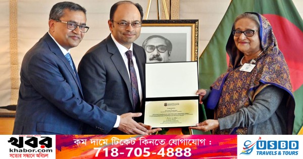 ব্রাউন ইউনিভার্সিটির স্বাস্থ্যবিষয়ক সিনিয়র ভাইস প্রেসিডেন্ট এবং ওয়ারেন অ্যালপার্ট মেডিকেল স্কুলের মেডিসিন অ্যান্ড বায়োলজিক্যাল সায়েন্সের ডিন ডা. মুকেশ কে জৈন প্রধানমন্ত্রীর কাছে তার অবস্থানস্থল দি লোটে নিউইয়র্ক হোটেলে প্রশংসাপত্রটি হস্তান্তর করেন।
