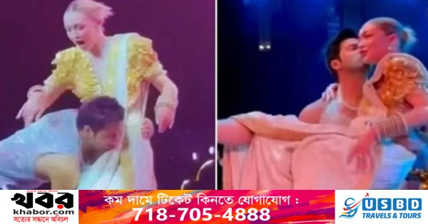 ওই অনুষ্ঠানের একটি ভিডিও ভাইরাল হয়েছে। সেই ভিডিওতে দেখা যাচ্ছে, মঞ্চে নাচ করছিলেন বরুণ ধাওয়ান। হঠাৎ সেখানে হাজির জিজি। ঘটিহাতা ব্লাউজ, সাদা-হলুদ শাড়ি পরে বরুণের দিকে এগিয়ে যেতেই তাকে কোলে তুলে নেন নায়ক। ঘোরাতে থাকেন বনবন করে। এরপরই গাল লক্ষ্য করে খেয়ে ফেলেন চুমুও।