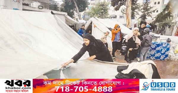 ইসরায়েলি হামলায় বাস্তুচ্যুত হয়ে পড়া গাজার ফিলিস্তিনিদের দুর্ভোগ কয়েক গুণ বাড়িয়েছে বৃষ্টি ও শীত। মূলত প্লাস্টিকের তাঁবুতে থাকতে হচ্ছে তাদের। মধ্য গাজার দেইর আল-বালাহ এলাকায় ভারি বৃষ্টি ও বাতাসের মধ্যে শীতের পোশাকের অভাবে দুর্ভোগ পোহাতে হচ্ছে লোকজনকে।