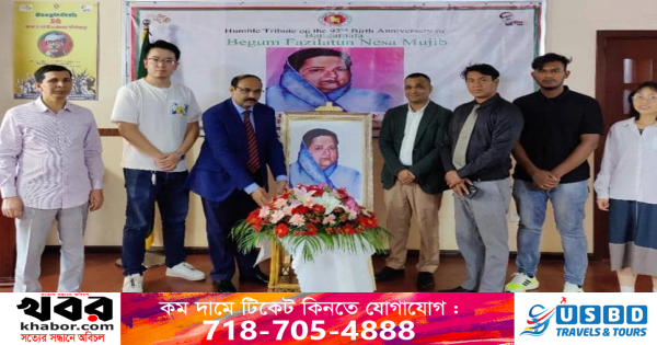 চীনে জাতির পিতা বঙ্গবন্ধু শেখ মুজিবুর রহমানের সহধর্মিণী বঙ্গমাতা বেগম ফজিলাতুন নেছা মুজিবের ৯২তম জন্মবার্ষিকী পালিত হয়েছে। সোমবার অনুষ্ঠানের শুরুতে কনসাল জেনারেল এ এফ এম আমিনুল ইসলাম বঙ্গমাতা বেগম ফজিলাতুন নেছা মুজিবের প্রতিকৃতিতে পুষ্পস্তবক অর্পণ করেন। তার স্মৃতির প্রতি গভীর শ্রদ্ধা জানিয়ে তিনি বলেন, বঙ্গমাতা ছিলেন অসীম ধৈর্য্যের প্রতিমূর্তি। তিনি বুদ্ধিমত্তা, ধের্য্য ও সাহস নিয়ে যেকোনো পরিস্থিতি মোকাবিলা করতেন। আমৃত্যু বঙ্গবন্ধুর পাশে থেকে একজন যোগ্য ও বিশ্বস্ত সহচর হিসেবে দেশ ও জাতি গঠনে অসামান্য অবদান রেখে গেছেন।