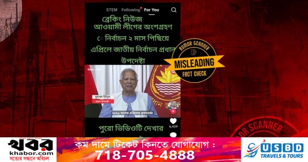 বাংলাফ্যাক্ট জানায়, আওয়ামী লীগ অংশগ্রহণে আগামী জাতীয় নির্বাচন দুমাস পিছিয়ে এপ্রিলে হবে-প্রধান উপদেষ্টা ড. মুহাম্মদ ইউনূস সম্প্রতি এমন মন্তব্য করেছেন দাবি করে টিকটকে একটি ভিডিও ছড়ানো হয়েছে।