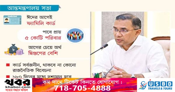 প্রতিশ্রুতি অনুযায়ী ঈদুল ফিতরের আগেই ফ্যামিলি কার্ড বিতরণের সিদ্ধান্ত নিয়েছে সরকার। পর্যায়ক্রমে ৫ কোটি পরিবারকে ফ্যামিলি কার্ড দেওয়ার সিদ্ধান্ত নেওয়া হয়েছে। দ্রুতই এ প্রক্রিয়া শুরু হবে। গতকাল সকালে সচিবালয়ে প্রধানমন্ত্রী তারেক রহমানের নেতৃত্বে অনুষ্ঠিত আন্তঃমন্ত্রণালয় সভায় এ সিদ্ধান্ত চূড়ান্ত হয়।