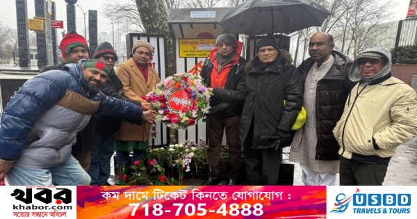 Shibbir Ahmed, New York: International Mother Language Day and Ekushey February were observed in front of the United Nations Headquarters in alignment with Bangladesh time. The event has been held continuously for 35 years, with this year’s program marked by the youngest participant placing floral tributes at a symbolic Shaheed Minar. Despite heavy rain and unfavorable weather, attendees gathered to honor the day through songs, poetry recitations, and discussions.
