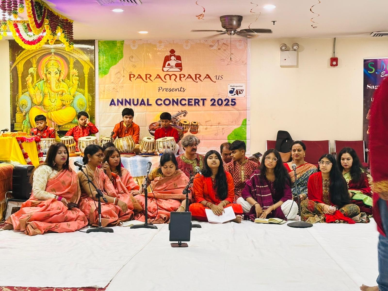 নিউইয়র্কে অনুষ্ঠিত হয়েছে পরম্পরা সংগীত একাডেমি ইউ এস এ’র বার্ষিক সংগীত সম্মেলন ২০২৫। ২০ জুলাই রবিবার, ফ্ল্যাশিং এর হিন্দু সেন্টারে মন্ত্র পাঠ এবং প্রদীপ প্রজ্জ্বলনের মধ্যে দিয়ে সম্মেলনের সূচনা করেন হিন্দু সেন্টারের পুরোহিত দীক্ষিত জী। টেলিভিশন ব্যক্তিত্ব দিমা নেফারতিতি’র সঞ্চালনা ও শুভেচ্ছা নিবেদনের পরেই শুরু হয় সমবেত ভজন পরিবেশনা। পরম্পরা সংগীত একাডেমি ইউ এস এ’র সংগীত গুরু বিপ্লব মুখার্জি’র নেতৃত্বে ভজন পরিবেশন করেন একাডেমির শিক্ষার্থীরা। তবলায় ছিলেন একাডেমির তবলা-গুরু রবিশংকর ভর্টাচার্য।